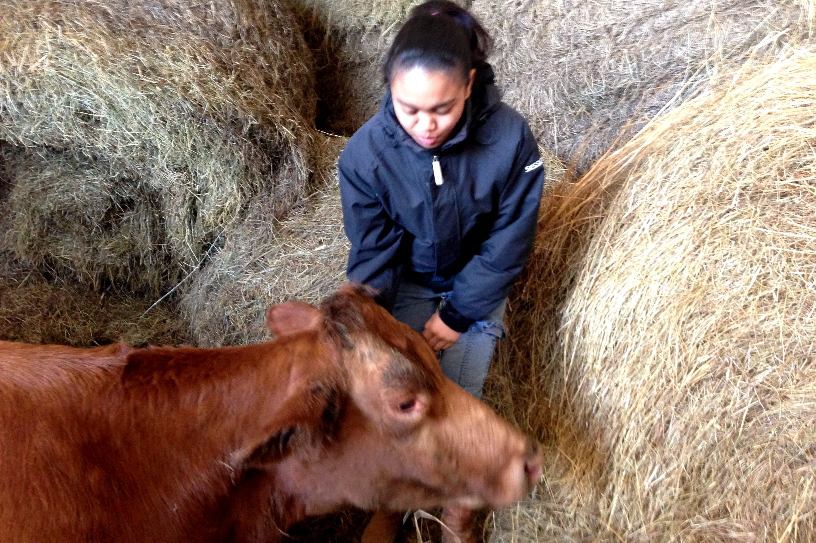 The dairy heifer looked tired. Krystynne and I watched as Bess worked. Dot was offered water and another liquid, turquoise in color, full of vitamins. She drank, but not enough. She was encouraged to stand, but she didn’t want to move. (I was told that getting her up and moving would be the best thing for her.) We resigned to simply offering her comfort. A good scratch under the chin was appreciated.