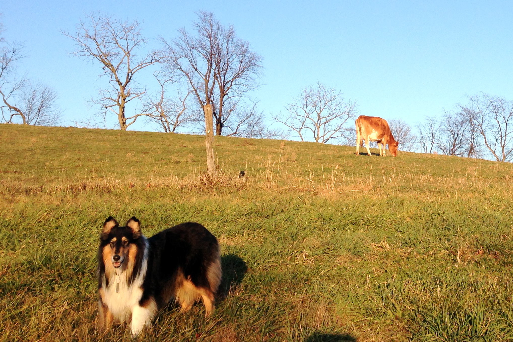 Then, we drove up to the hayfield. We walked with the dogs–Tootsie and Bess’s chocolate lab, Bear. There were cows in the next field over when we started our walk, but Tootsie was too focused on us to notice. As we settled in to the walk and Tootsie realized she need not focus all of her attention on the humans, she explored. She found the innards of a recently gutted deer. And a few burrs found their way into her coat.